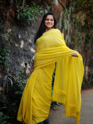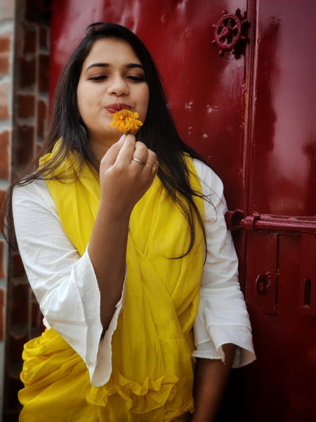 This sunshine yellow gorgeous mul saree with ruffle edges is definitely going to make your day bright and beautiful.
