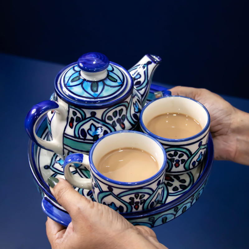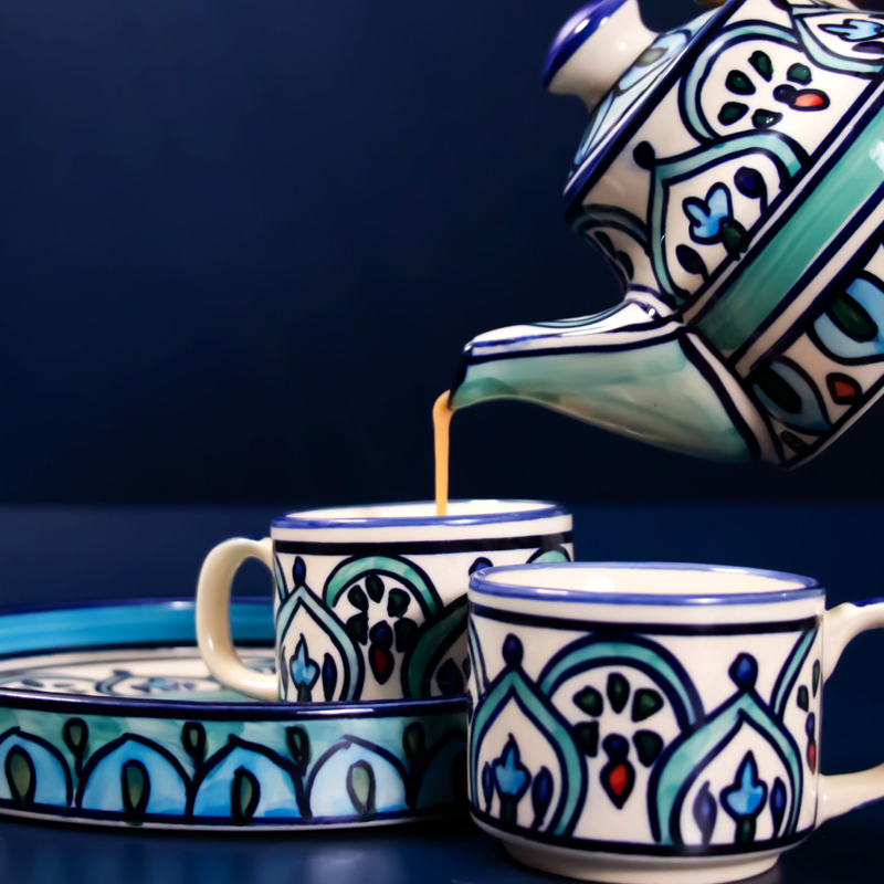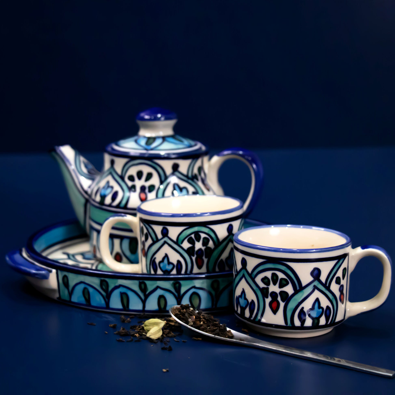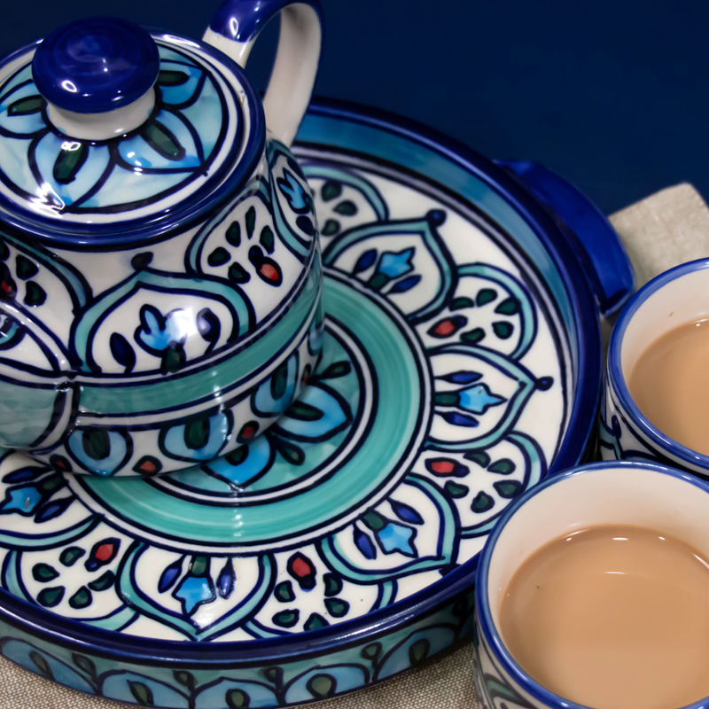 Handmade Beautiful Bright colorful morning tea set would be a great start to a great day ahead. A green tea set with a teapot, 2 cups and a ceramic round tray with handles. The blue and green color has a luxurious elegance and adds a chic element to the set. The ceramic tray completes the look of the set and makes it easy to carry and a delight to serve in. The ceramic tray makes it very convenient to serve bed tea in the morning.